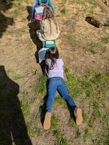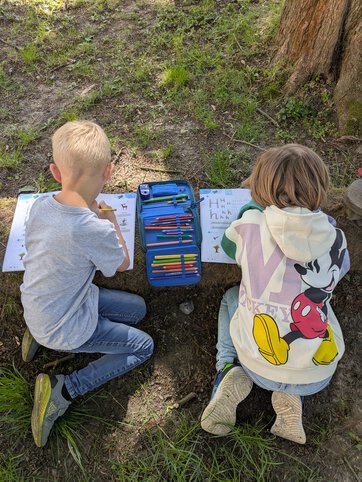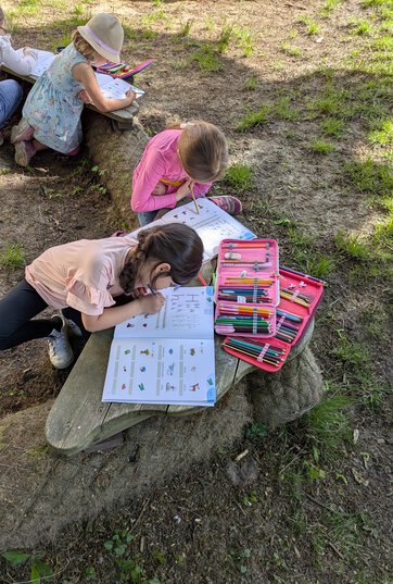 Endlich wird das Wetter wieder schöner. Sofort hat es uns mit unseren Arbeitsheften und Etuis bewaffnet nach draußen in den Garten gezogen. Nach dem Arbeiten haben wir natürlich auch noch ein bisschen im Garten gespielt.