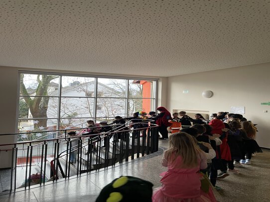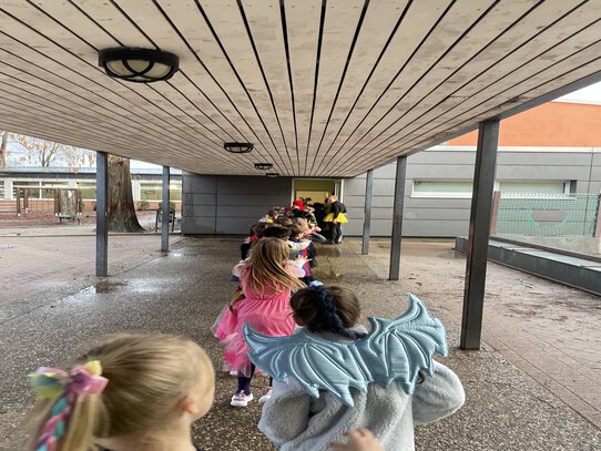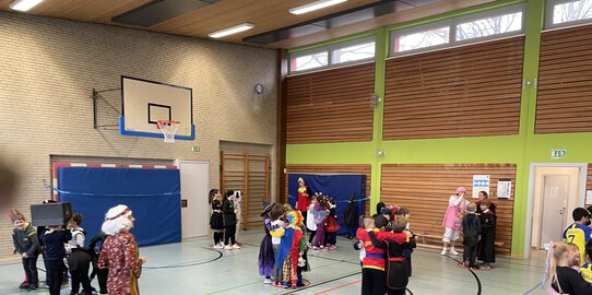 In der Pandaklasse wurde dieses Jahr mit großer Freude Karneval gefeiert. Mit tollen Kostümen haben wir getanzt und Spiele gespielt. Besonders toll fanden wir die Polonaise durch die Schule, das Feiern mit den anderen Kindern in der Sporthalle und das Süßigkeitenbüfett.